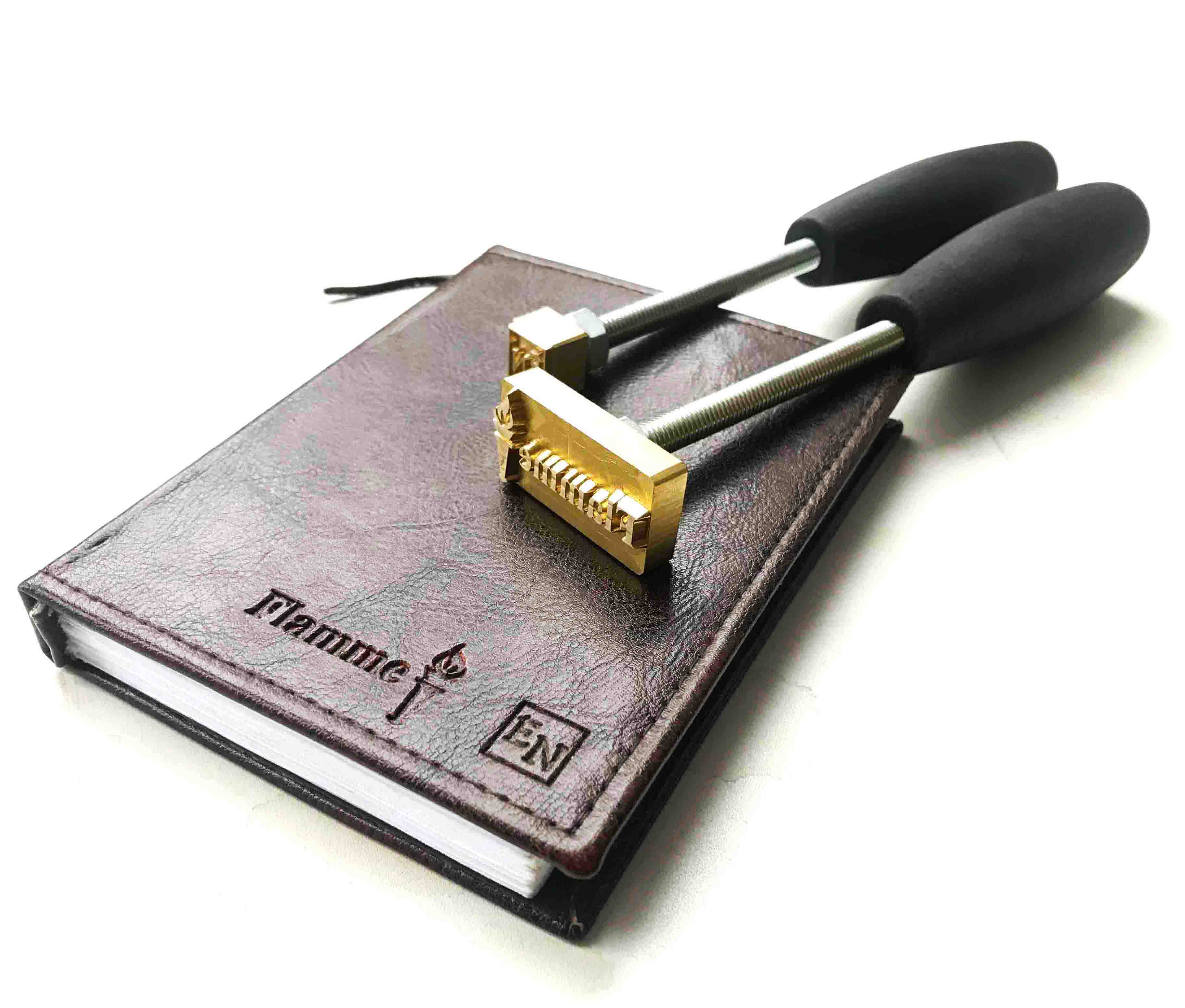 Тиснение производится на коже через фольгу или без. Для нанесения оттиска штамп рекомендуется нагреть. Не рекомендуется перегревать изделие, так как оттиск выйдет нечитаемым.